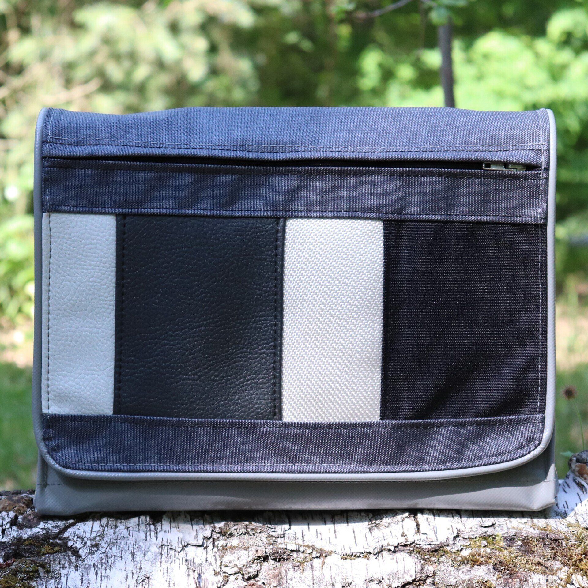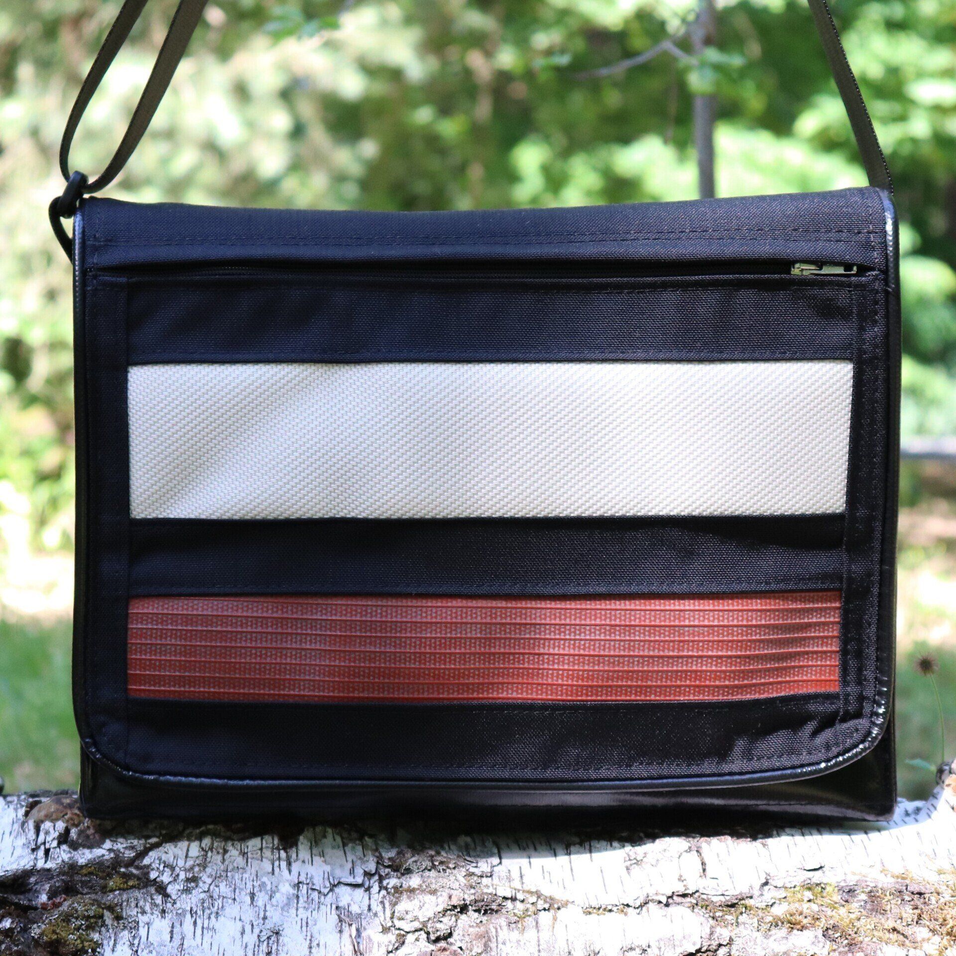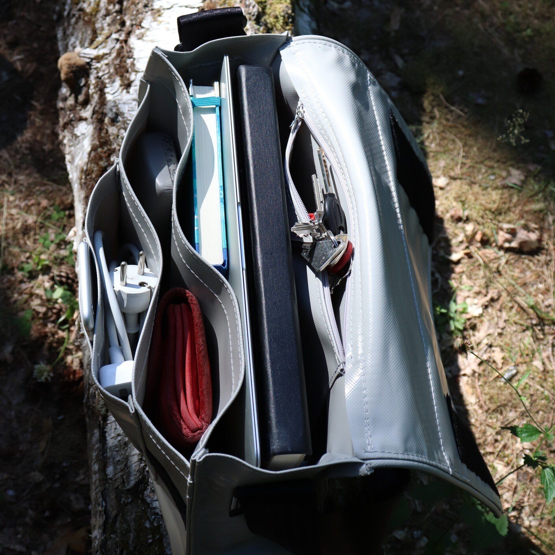 Gearbeitet aus LKW- Plane (Corpus) kombiniert mit anderen Materialien wie z.B. Kunstleder, recyceltes Segel sowie Cordura u.a.