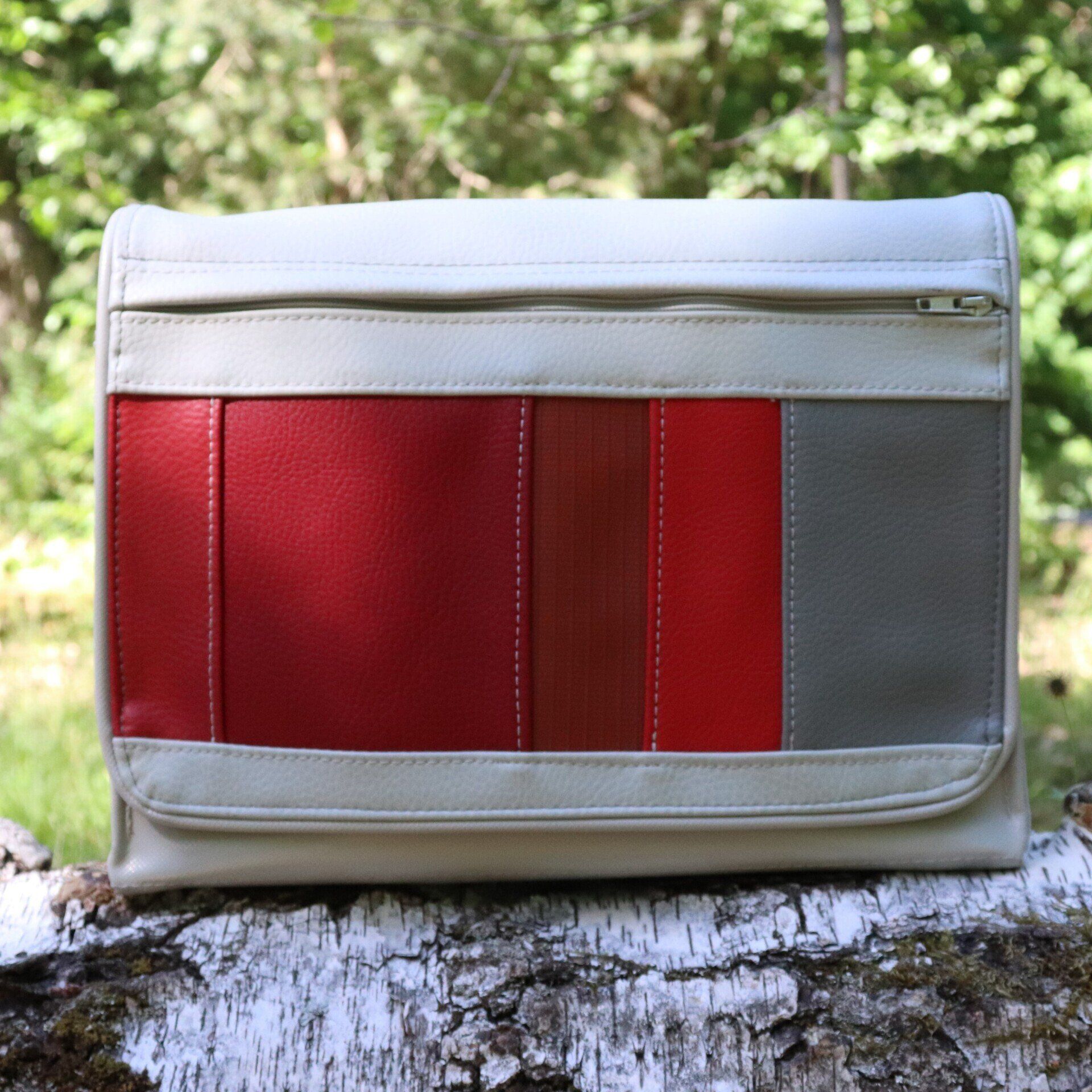 Breite 34 cm, Höhe 25 cm, Tiefe 12cm, Gurt 5 cm breiter Sicherheitsgurt. Verschluss Klettband.